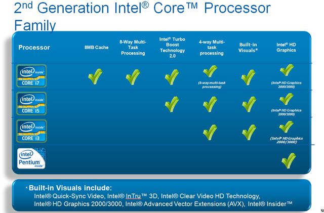 Intel анонсировала Sandy Bridge Выставка потребительской электроники CES 2011 является прекрасной возможностью для Intel представить свои новые процессоры c кодовым именем Sandy Bridge. Чипы второго поколения Core iX улучшают общую производительность (в некоторых случаях весьма значительно) и поднимают мощь и совместимость встроенный графики на новый уровень. Любой процессор нового семейства без труда может обеспечить просмотр видео высокой чёткости, ускоренно кодировать мультимедийные данные и передавать по беспроводному интерфейсу HD-контент на удалённый дисплей. ![]() Гораздо более быстрое сжатие видеопотока будет поддерживаться только в том случае, если используемая программа будет применять последние функции процессоров Sandy Bridge. Существуют небольшие сомнения относительного того, что разработчики будут активно использовать специальные блоки новых чипов Intel. Возможно, поддержка будет весьма ограниченной. ![]() Наконец, компания продолжает улучшать свою архитектуру x86 и производительность решений, как в однопоточных, так и в многопоточных задачах. В то время как первая версия Turbo Boost позволяла увеличивать частоту только одного ядра, вторая версия технологии может разгонять также графику и до 4 вычислительных ядер, насколько позволяют температурные ограничения. Это не только даёт возможность увеличить абсолютную производительность, но также и экономит энергию: задачи исполняются быстрее и процессор возвращается в экономичный режим также быстрее. Благодаря тому, что в моменты пиковой нагрузки процессор может на короткое время значительно увеличивать свою частоту, с точки зрения пользователя создаётся впечатление, что система боле мощная. ![]() Флагманом является Intel Core i7-2920XM Extreme Edition, ниже которого в различных ценовых сегментах размещается ещё 12 моделей Core i7. В мобильном секторе это i7-2820QM, i7-2720QM, i7-2630QM, i7-2635QM, i7-2620M, i6-2649M, i7-2629M (LV), i7-2657M и i7-2617M (ULV), а в настольном — i7-2600K, i7-2600S и i7-2600. Также Intel представила 12 моделей Core i5, с i5-2540M, i5-2520M, i5-2410M и i5-2537M (ULV) — для мобильного рынка и i5-2500K, i5-2500S, i5-2500T, i5-2500, i5-2400, i5-2400S, i5-2390T и i5-2300 — для настольного. Наконец, представлено и 4 чипа начального уровня Core i3: i3-2310M — для ноутбуков и i3-2120, i3-2100 и i3-2100T — для настольных ПК. Вместе с ними анонсировано ни много, ни мало 10 новых чипсетов: QS67, QM67, HM67, HM65 и UM57 для мобильного рынка и P67, H67, Q65, Q67 и B65 — для настольного. Также компания предлагает новые беспроводные решения: Wireless-N 1030, Advanced-N 620S, Advanced-N 6230 и Advanced-N + WiMAX 6150. ![]() Можно быть уверенным, что вскоре производители представят массу решений на базе Sandy Bridge: процессоры весьма хороши, да и выпуск решений предыдущего поколения Intel будет постепенно сворачивать. Всего компания сообщает более чем о 500 готовящихся к выходу продуктах, использующих новые чипы Intel. Таким образом, на CES можно ожидать целой массы ноутбуков от различных брендов. Судя по тестам Ubergizmo, чип среднего уровня Core i5 2500K (3,3 ГГц) имеет вполне неплохую производительность, практически на уровне Core i7 940 (3,2 ГГц), который принадлежал к высокому классу на момент запуска. Таким образом, 2500K имеет очень неплохой рыночный потенциал. ![]() ![]() |