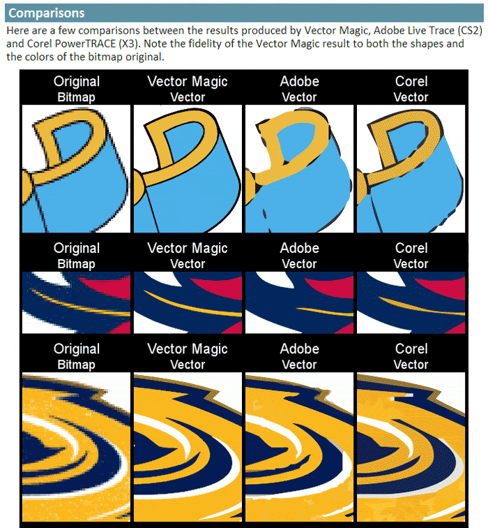 в корне не соглашусь люди рисующие в основном пользуются Adobe Illustrator( там кстати тоже есть свой трайс). в Корке мне ОЧЕНЬ не нравиться трайс куча лишних объектов общая корявость, чем лучше или хуже данная софтина можно долго разговаривать, я допустим считаю что лучшие трайс - это руками но для примера вот что получается с помощью данной софтины http://i296.photobucket.com/albums/m...cg/34t4ca9.gif или вот http://vectormagic.com/desktop/videos |